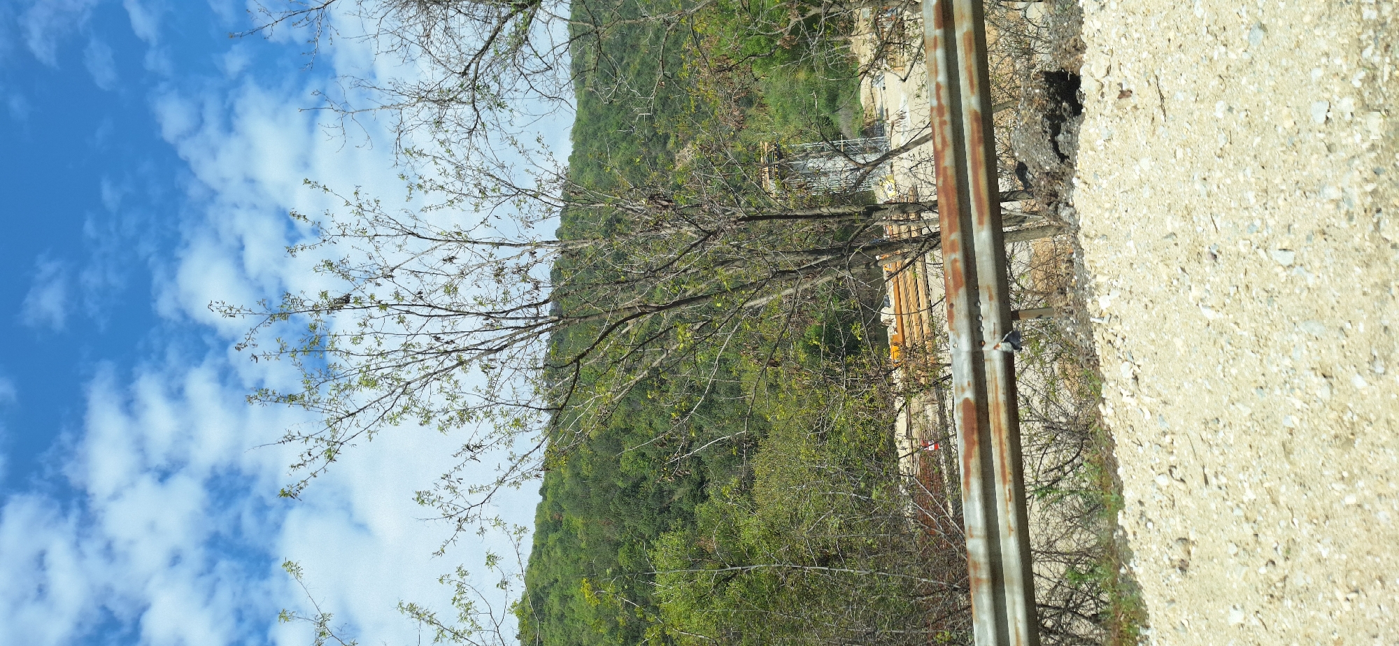 The image presents a scene in Kresna, Bulgaria. The view is dominated by a forested hillside on the left. In the foreground, there are two rusted metal poles with vegetation around them. Beyond the poles, there is a construction site. The upper left of the image is filled with a blue sky with scattered white clouds. A portion of the foreground on the right appears to be a road or path made of light-colored gravel.