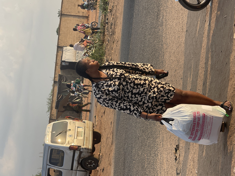 A woman in a patterned dress carries a white plastic bag along a street. The bag has text indicating “DC INTERNATIONAL MARKETING COMPANY LTD”. In the background, a damaged white van is parked by the roadside. Several people and motorcycles are visible beyond the van. The sky is overcast.