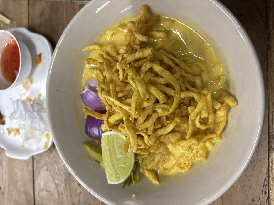 - "A light-colored ceramic bowl containing Khao Soi, a Northern Thai curry noodle dish, is positioned centrally on a wooden table with visible wood grain" by FM-SW44b2, licensed under CC BY 4.0