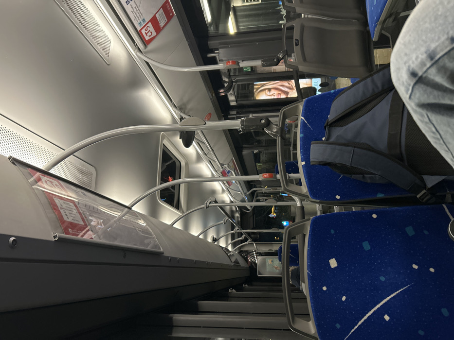 The interior of a bus or train is depicted with rows of blue seats featuring a speckled pattern. Overhead handrails arch across the aisle. Windows reflect the dark exterior. Advertising screens are visible above the seats. One passenger is partially visible, wearing jeans and with a backpack on the seat. The lighting is bright.