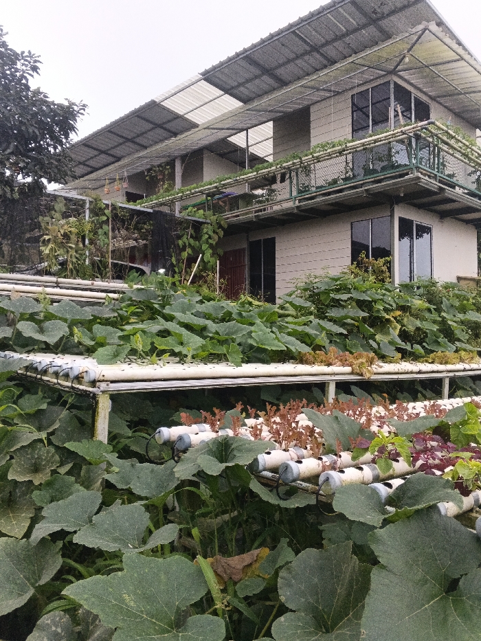 A two-story house with a metal roof is surrounded by lush greenery. The first floor features large windows. On the second floor, there's a balcony with plants and flowers growing along the railing. Below, a hydroponic system of white pipes supports various crops, including lettuce and squash. Large green leaves dominate the foreground, obscuring parts of the structure, creating a dense and vibrant garden.