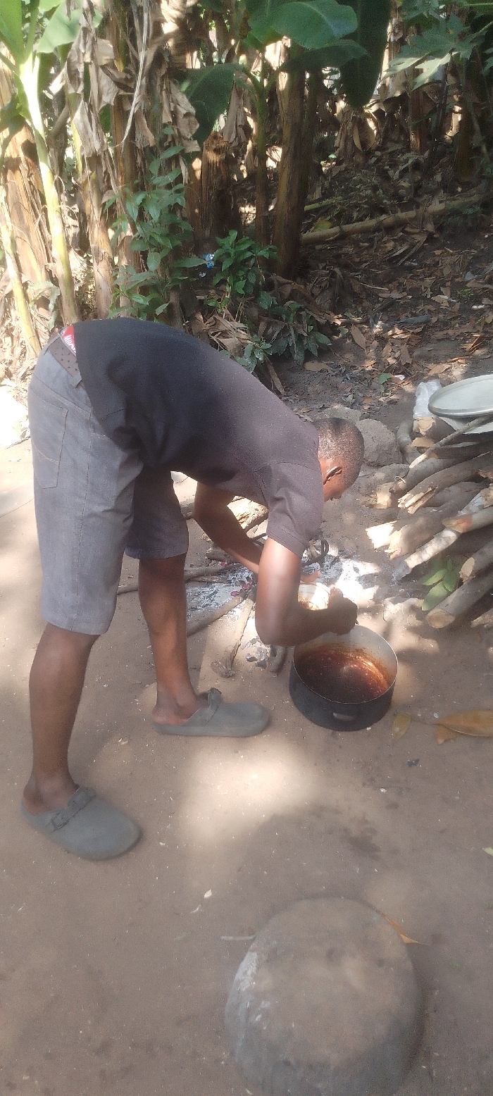 In an outdoor, unpaved setting in Ohafia, Nigeria, a male individual is depicted from a slightly elevated perspective, bent forward at the waist. The subject, wearing a black short-sleeved t-shirt, grey shorts, and light grey slip-on slippers, is actively tending to a cooking pot. A red and black patterned underwear waistband is visible above the shorts. His arms are positioned over a dark metal pot containing a reddish-brown substance, which is cooking over an open wood fire. The fire consists of glowing embers and ash, surrounded by various logs and wood debris. To the right of the cooking area, a stack of unburnt logs is visible, along with a silver-colored metal tray or lid. The ground is bare earth, light brown in color, with scattered organic matter. In the foreground, a large, rounded grey stone or concrete block rests on the ground. The background features dense, natural vegetation, primarily consisting of banana plants with large green leaves and dry, brown fronds, indicating a lush, semi-rural environment under natural light.