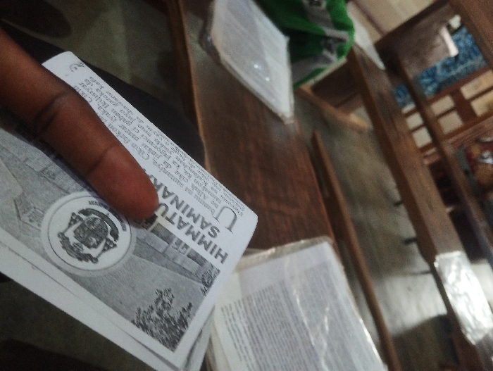 A hand holds a paper printed in black and white. The text reads "HIMMATU SAMINAR U banmu na samaniya, Cikin farkon ne Allah cike da jokas marar iyaka, Cik aka, ka jagomanci ci gaban. Ikilisiyar Chayyo gareka ta 2". The paper has a circular emblem on the left side, featuring a building or structure within. The background shows a wooden surface with other papers and a wooden chair.