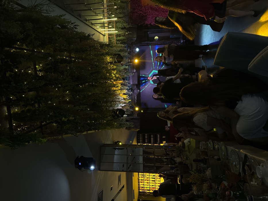 The image depicts an indoor evening event at Florence Restaurant-Club in Yerevan, Armenia. The scene features a dimly lit, spacious hall with a high ceiling extensively covered in artificial green foliage interspersed with numerous small, warm white string lights. Several spotlights illuminate specific areas. In the foreground and mid-ground, a long dining table is visible on the left, set with white plates and dark bottles, with several partially obscured individuals seated. A large, reflective mirrored pillar stands centrally on the left. Behind this pillar, a tall, illuminated display unit showcases numerous bottles, casting a warm yellow glow. Towards the center-right, a raised stage is prominent, backed by a large LED screen displaying a dynamic, multi-colored geometric pattern, specifically a central glowing hexagon with radiating lines. A male performer, wearing a dark suit, stands center-stage, holding a microphone and appearing to sing or speak. Approximately ten individuals, primarily young adults, are gathered in front of the stage, standing and moving, suggesting dancing or engaging with the performance. Their attire is a mix of light and dark colors. On the far right, a decorative wall panel composed of pink or red floral elements is visible, beneath a series of modern cylindrical pendant lights.