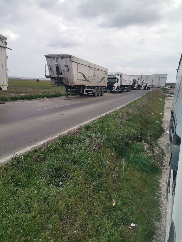The scene depicts a rural road in the vicinity of Slanchevo, Bulgaria, under a heavily overcast sky. A linear queue of white semi-trailer trucks, each pulling a large, enclosed hopper-style trailer, is stationary on the right side of a two-lane asphalt road. The lead visible trailer displays the branding "AMYLUS" and a dark, stylized emblem; an individual wearing a light-colored head covering is observable on a rear platform of this trailer. Further down the convoy, approximately three dark-clad individuals are standing on the left side of the road adjacent to the trucks. The immediate roadside to the right of the asphalt consists of an unkempt grassy verge containing various pieces of litter, including plastic bags and wrappers. To the left of the road, a narrow strip of grass precedes an expansive green agricultural field stretching to the horizon, where a solitary, leafless tree stands. The far right background reveals a large, white-sided structure, possibly an industrial building or storage facility. The perspective is from ground level, likely from beside a vehicle.