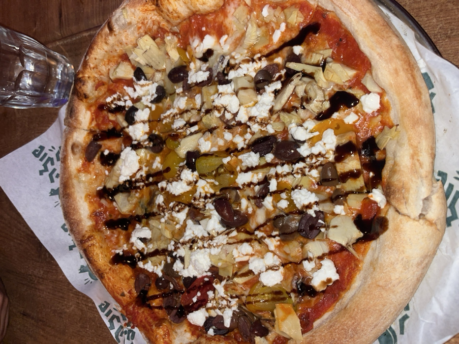 An overhead view captures a round, cooked pizza situated on a metallic tray. The pizza features a tomato sauce base, topped with crumbled white cheese resembling feta, whole dark olives, light green/yellow bell peppers, quartered artichoke hearts, and scattered reddish components consistent with sun-dried tomatoes. A dark, viscous glaze, indicative of balsamic, is drizzled in a zig-zag pattern across the entire pizza surface. The pizza and tray rest on a white paper liner displaying a repeating green pattern that includes stylized dog-like animal heads and Hebrew text, partially visible as "פיצה גורמה ביי..." (Gourmet Pizza by...), aligning with the branding of Pizza Boutique. A clear, textured drinking glass containing water is positioned in the upper right corner of the frame. The underlying surface is a dark brown wooden table. No individuals or active interactions are present. The scene is set within **Pizza Boutique in Ramat Gan, Israel**.