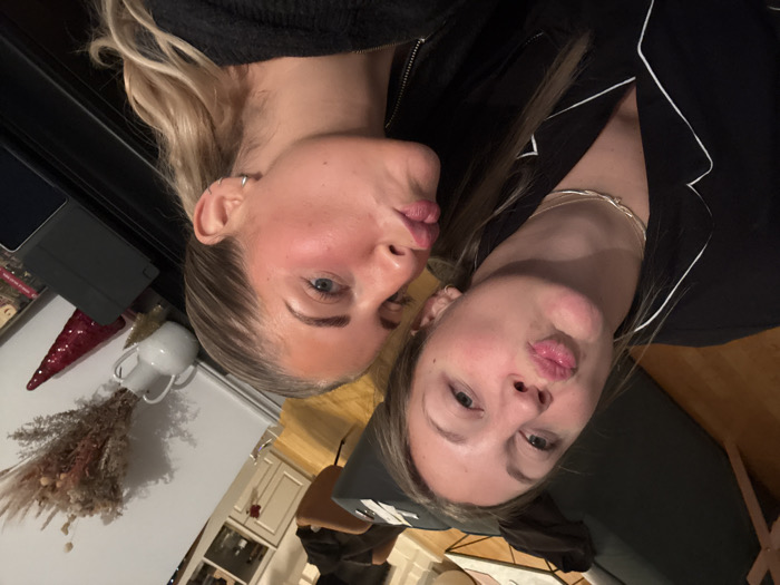 Two women are close together and facing the camera with puckered lips. The woman on the left has blonde hair and wears a dark sweater or jacket. The woman on the right has light brown hair and wears a black top with white trim around the collar. In the background are parts of a room, including a white cabinet, dried flowers, and a Christmas decoration. The image is slightly tilted.