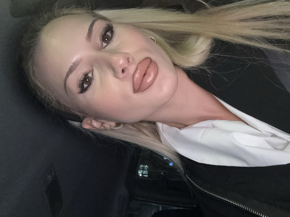 A headshot-style image, taken at night within a vehicle in Sofia, Bulgaria, depicts a female subject looking directly into the camera. The woman has long blonde hair, styled with a dark headband, and prominent makeup, including dark winged eyeliner, extended eyelashes, and glossy, full lips. She is wearing small hoop earrings. Her attire consists of a black jacket, possibly a bomber style, over a white garment with visible folds around the neck. The background is dark, revealing the vehicle's interior and headliner. Through the left window, indistinct illuminated structures, possibly buildings, and blurred lights are visible, consistent with an urban nighttime environment. No other individuals or explicit actions are discernible.