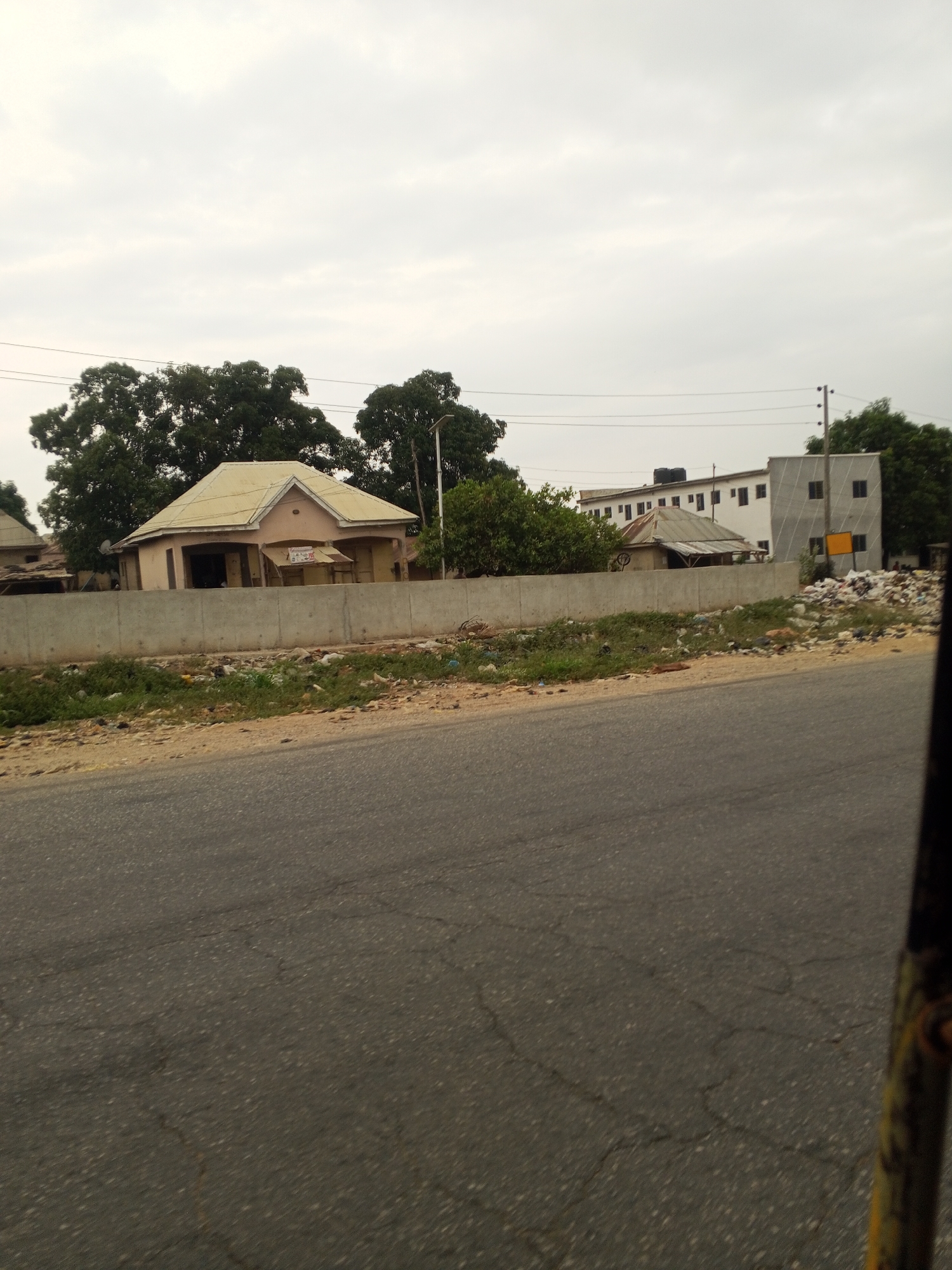 This image depicts a street scene in Lokoja, Nigeria, under an overcast sky. In the immediate foreground, an asphalt road surface with visible cracks and aggregate occupies the lower third of the frame. A dark, vertical object, likely a structural component of a vehicle or apparatus, is partially visible along the extreme right edge. Beyond the road, a strip of unkempt ground runs horizontally, featuring sparse green and brown vegetation interspersed with scattered litter, including plastic bags and various debris. This strip terminates at a low, light grey concrete perimeter wall, extending across the majority of the midground. Behind the concrete wall, multiple structures and dense vegetation are visible. To the left, a single-story building with light beige/faded yellow painted walls and a corrugated metal roof features a prominent gable section over a recessed front facade with multiple openings, suggesting storefronts. A circular white satellite dish is mounted on its roof. To the immediate left of this building, other indistinct structures are partially visible. Behind and to the right of this building, dense green foliage from large trees is present. Further right, between the single-story building and a larger multi-story structure, a smaller, possibly temporary, structure with a corrugated metal roof is visible. Beyond this, a multi-story white building with numerous dark rectangular windows is present, topped by a black water tank. Adjacent to it on the right stands a multi-story grey building with a patterned facade and dark windows. A utility pole with overhead wires is positioned to the right of this grey building. In front of the grey building and to the right of the concrete wall, a substantial pile of assorted refuse is accumulated on the ground. No individuals or discernible actions are visible within the frame. The sky is uniformly overcast and light grey, suggesting a cloudy day.
