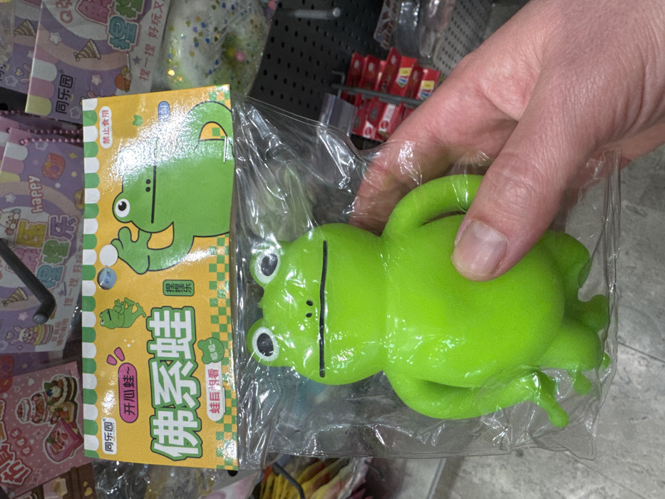The image displays a close-up view of a human hand holding a packaged novelty toy in a retail store setting in Milan, Italy. The central object is a bright lime-green, soft-bodied toy in the shape of a frog, approximately 15-20 cm in height, sealed within a transparent plastic bag. The frog features simple black-dot eyes with white pupils and a thin black horizontal line for a mouth, presenting a neutral facial expression. The packaging includes a yellow cardboard header with green and white striped borders, featuring prominent Chinese characters, including "佛系蛙" (Buddhist Frog/Zen Frog) and "开心蛙" (Happy Frog), alongside cartoon illustrations of green frogs. A fair-skinned human left hand, showing distinct skin texture and a clean fingernail on the thumb, is gripping the lower right side of the packaged toy. The background reveals a blurred retail environment, including a black pegboard display system with metal hooks. Various other out-of-focus consumer products in colorful packaging, some depicting cartoon cakes and rabbits, are visible on these hooks. Illumination appears consistent with overhead fluorescent lighting common in retail establishments.