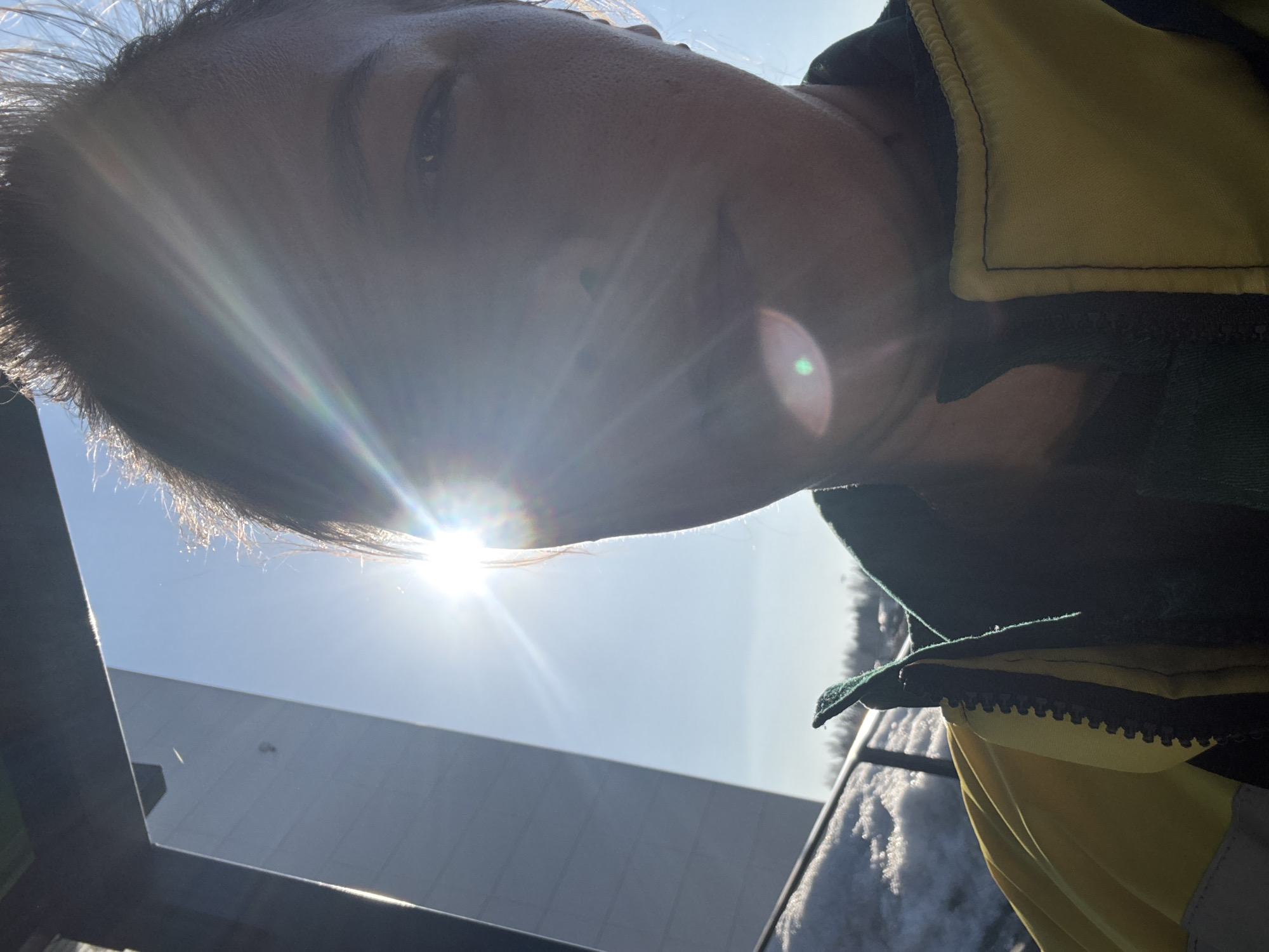 The image captures a backlit close-up selfie of an individual in Ромашка Нп, Russia. The subject's face occupies the right half of the frame, significantly obscured by direct sunlight and prominent lens flare originating from the upper-left-center. The individual is wearing a yellow jacket with a dark green collar, visible across the lower portion of the image. To the left, a tall, light-colored vertical architectural structure with visible paneling extends upwards out of the frame. Below this structure, a snow-covered surface is present, with a dark metal railing partially visible. A faint, dark line of indistinct foliage is visible on the distant horizon. The sky is clear and blue.