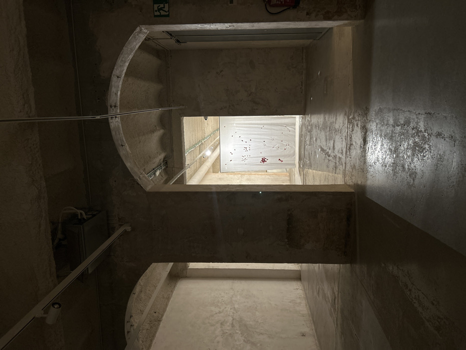 This image captures the interior of a contemporary exhibition space, consistent with a repurposed historic or industrial building in Barcelona, Spain. The foreground is dimly lit, revealing exposed, rough concrete walls and floors, and a textured concrete ceiling with visible modern track lighting. A large, rectangular concrete pillar stands centrally. Two arched passages frame the pillar, opening into a brighter room beyond. To the right of the central archway, a red fire extinguisher is mounted on the wall below a green-on-white emergency exit sign. Through the arches, a large white fabric sheet hangs vertically, functioning as an art installation or backdrop. This sheet is adorned with numerous small, dark, irregular markings and several prominent, irregular red splotches, mainly concentrated on its lower left section. The background room is illuminated by overhead track lighting. No individuals are present in the scene.