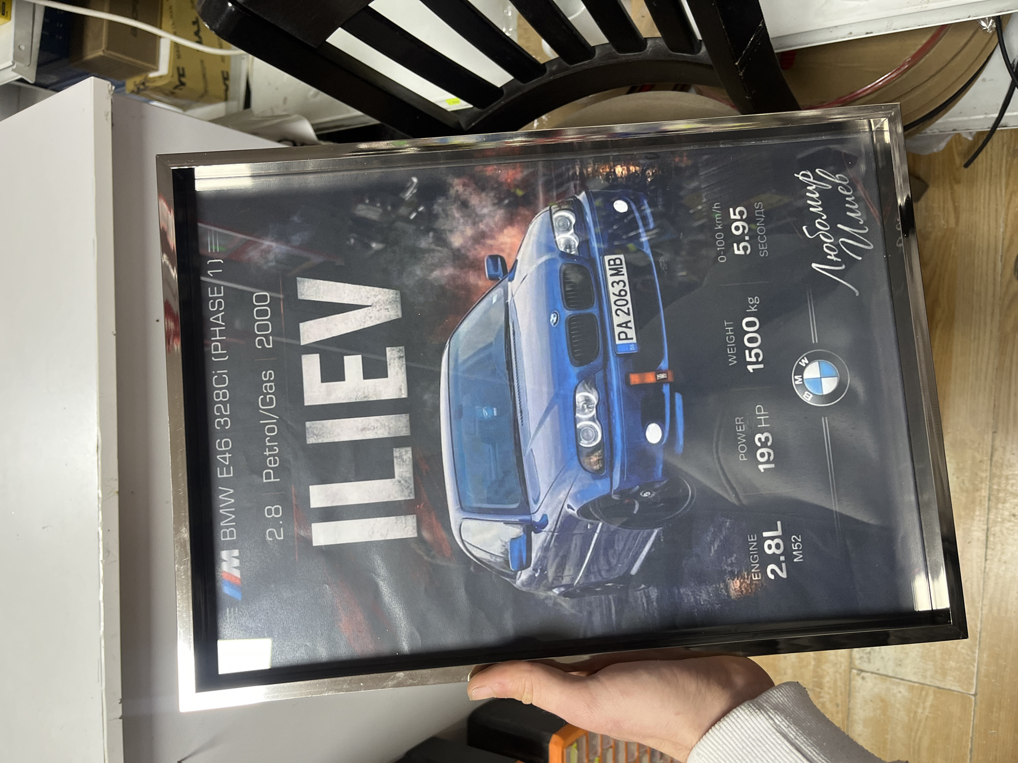 A light-skinned hand, wearing a white long-sleeved garment, holds a vertical framed print measuring approximately A3 size, tilting slightly forward. The print displays a blue BMW E46 328Ci (Phase 1) coupe from the year 2000, presented in a front three-quarter view with its headlights illuminated, against a dark background with orange and red smoky effects suggesting dynamic motion. Prominently featured on the print are the large white block letters "ILIEV" above the car image. Technical specifications are detailed: Engine M52, 2.8L Petrol/Gas; Power 193 HP; Weight 1500 kg; and 0-100 km/h in 5.95 seconds. The depicted car's license plate is "PA 2063 MB". A stylized signature "Любомир Илиев" (Lyubomir Iliev) is visible in the bottom right corner, beneath the BMW logo. The background of the scene includes a white shelf or counter in the upper right. To the right of the frame, parts of a dark chair with white horizontal slats are visible, along with several cardboard boxes bearing the "TYC" brand logo and a white cable. The bottom edge of the image reveals a light-colored tiled floor. The license plate "PA 2063 MB" indicates the depicted vehicle is registered in Pazardzhik, Bulgaria. No specific location within the city of Varna, Bulgaria, is discernible from the visual evidence in the image.