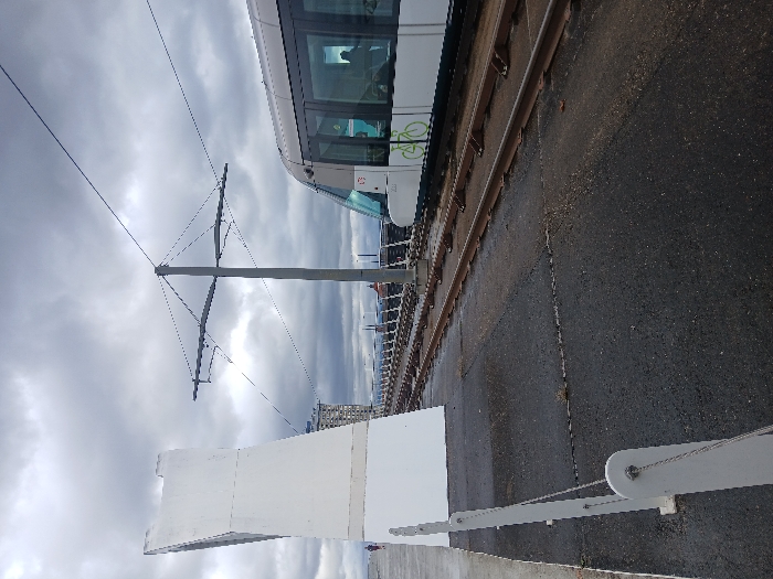 This image captures a segment of the Europabrücke (Europe Bridge) in Kehl, Germany, under a heavily overcast sky. The foreground features a dark asphalt surface with a white-edged pedestrian walkway on the left. This walkway is bordered by a white post-and-tensioned-wire railing system. A prominent, angular white concrete architectural element rises steeply from the left edge of the frame. Dual tram tracks run parallel to the walkway on the right, supported by an overhead catenary system from a central grey pole. A light-colored tram, likely from the Strasbourg public transport network (CTS), is visible on the rightmost track, facing away from the viewer. The tram's side features a green bicycle logo, and a passenger's silhouette is visible through its windows. In the far distance on the pedestrian walkway, a lone individual is seen walking. The background reveals a cityscape with distant buildings beneath the cloudy sky.