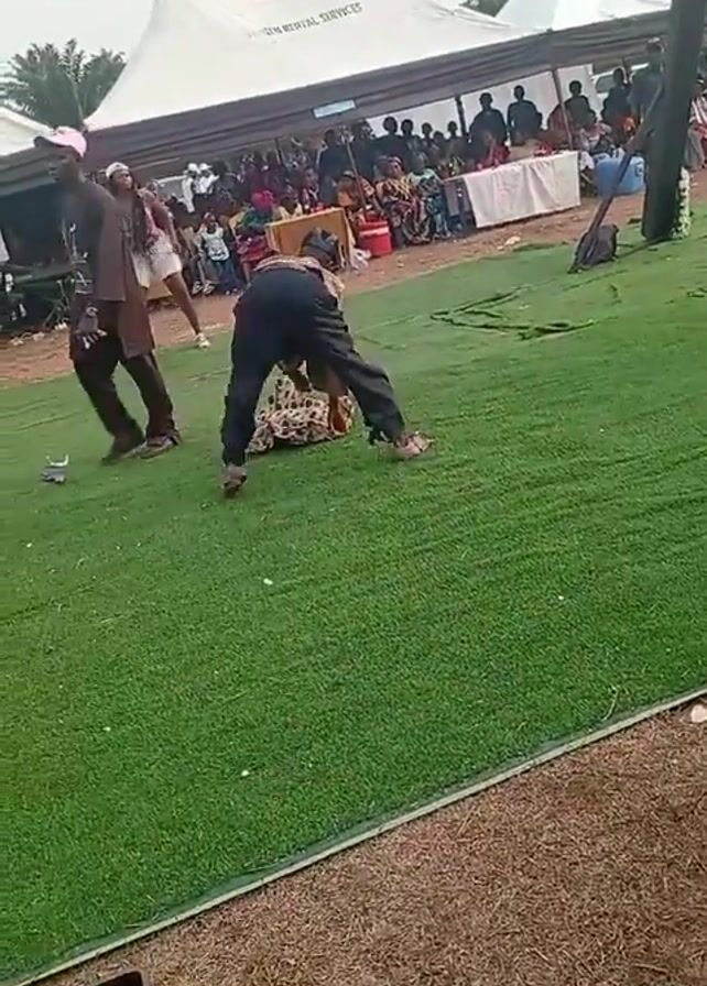 The video depicts a scene at an outdoor event, likely a celebration or gathering. There are people dancing on a green artificial turf surface, with spectators seated under white tents in the background. One man is bent over, seemingly struggling to get up. Another person walks past him. A crate of drinks is visible in the foreground. The overall environment suggests a festive atmosphere, despite the man's difficulty. The event appears to be taking place during the daytime, under overcast skies.