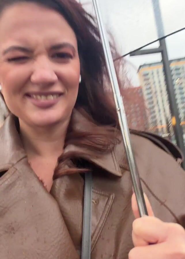 Here's a detailed description of the video: A woman is walking on a city street holding a clear umbrella. The weather appears to be rainy. She is wearing a brown leather trench coat and white wireless earbuds. In the background, there are buildings and a road with some car traffic. The woman is smiling and winking at the camera. She seems to be recording a selfie video while walking. Her hair is brown and being blown by the wind.