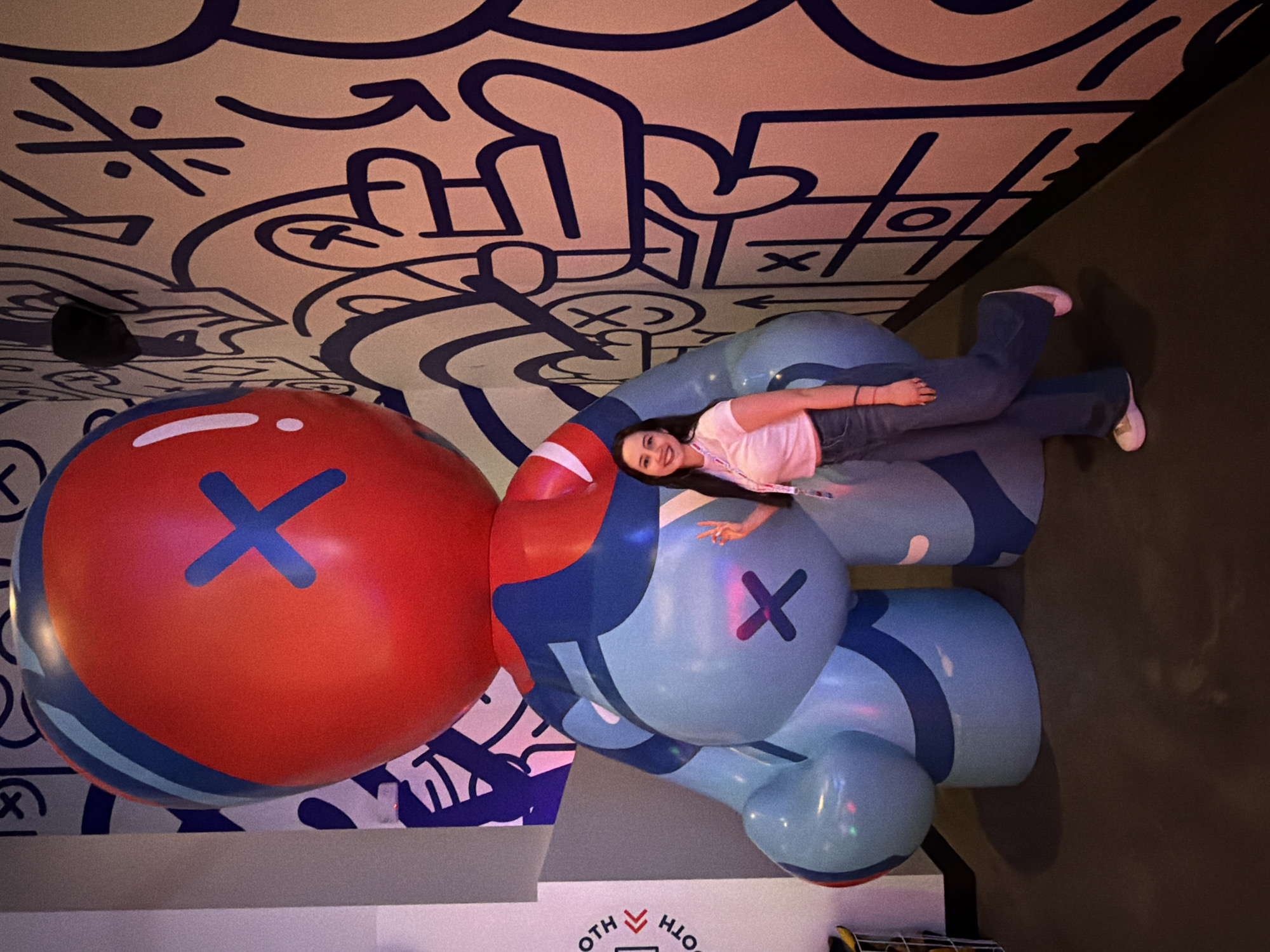 An indoor scene in Las Vegas, United States of America, depicts a young adult female posing next to a large, stylized inflatable figure. The female, with long dark hair, wears a light pink crop top, dark flared jeans, and white sneakers, and has an ID badge on a lanyard around her neck. She stands to the right of the figure, smiling towards the camera with her right hand raised in a peace sign. The inflatable figure is predominantly light blue and red, featuring a large red spherical head with a dark blue 'X' mark, and a bulbous light blue body with another dark blue 'X' mark on its rear. Dark blue stripes and smaller light blue accents adorn its form. The background consists of a wall covered in a dense, dark blue doodle-style mural on a light beige surface, featuring abstract shapes, 'X' marks, circles, and arrows. To the far left, a light gray wall section displays vertical text, possibly "BOOTH," and a metal wire basket is partially visible. The floor is dark and uniform.