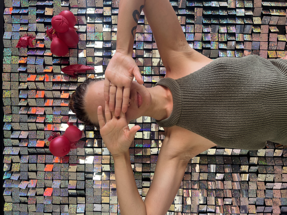 A fair-skinned individual covers their face with their hand. Their lips are parted slightly. They are wearing an olive green sleeveless top. A tattoo is visible on their forearm. A collection of red balloons is situated to the left. The background is comprised of reflective squares, predominantly silver, arranged in a grid pattern. The image has been rotated counter-clockwise.