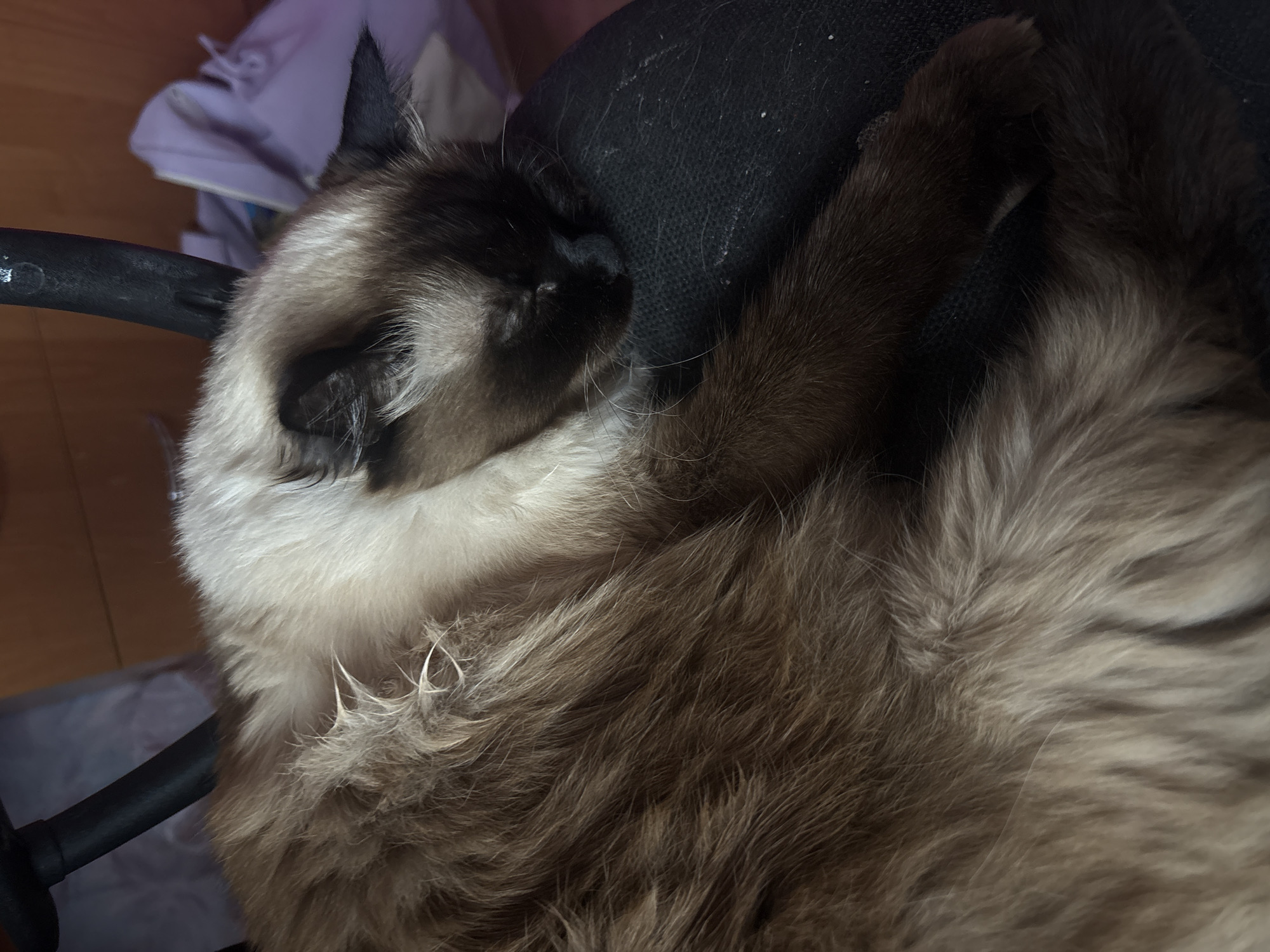 A close-up, high-angle shot depicts a Balinese cat curled up and sleeping on a black, upholstered office chair. The cat has cream-colored fur around its face and neck, transitioning to darker brown and black on its face, ears, paws, and body. The cat's eyes are closed, and its paws are tucked close to its body. The chair is positioned near a wooden floor and partially obscured by a light-colored garment in the upper-left corner of the frame. The image does not provide enough information to determine if the image was taken in Simferopol, Ukraine.