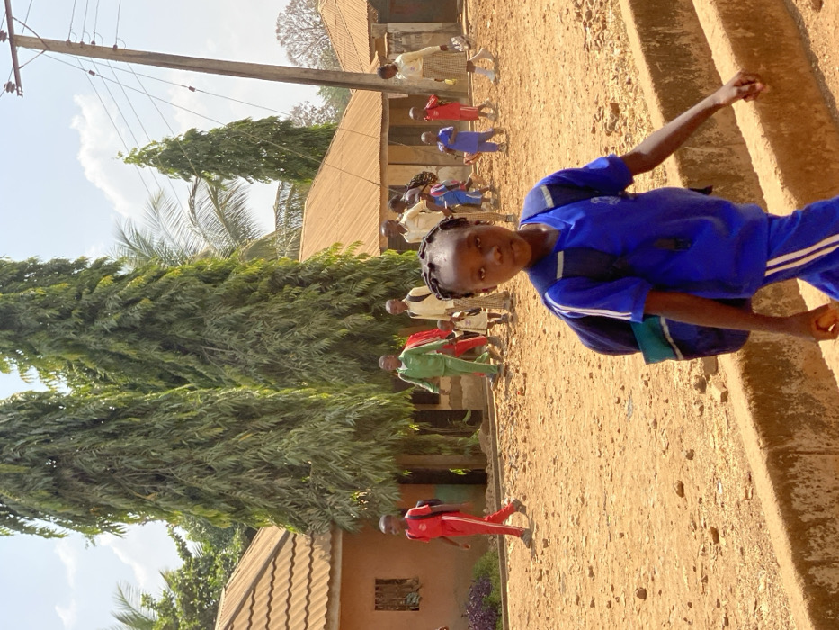 A young girl with braided hair and dark skin, wearing a blue school uniform with white shoulder and pant leg stripes, walks left-to-right in the foreground, carrying a dark blue and teal backpack