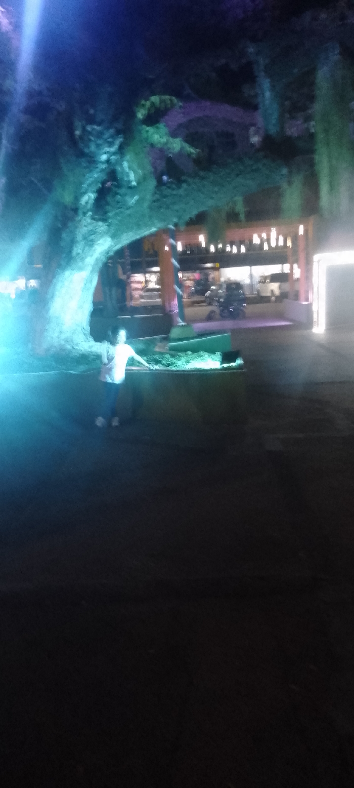 This image depicts an outdoor nighttime scene in La Fría, Venezuela. The foreground is dark, leading to a central area illuminated by diverse artificial light sources. A large, gnarled tree dominates the left side, bathed in intense blue and cyan light, with its branches extending across the upper portion of the frame. In the mid-ground, a rectangular planter containing low green foliage is prominently lit with green light. A single individual, likely a child or young person, stands slightly left of center, facing partially right, with their left arm extended towards or resting on the planter. This person wears a light-colored top, dark pants, and light-colored shoes. Behind the planter, to the right of the tree, a tall, slender, reddish-brown sculpture stands upright. The background features a street or roadway occupied by multiple blurred vehicles, including what appears to be a white van and several motorcycles. Beyond the street, a line of buildings displays illuminated windows, storefronts, and various vertical light fixtures, some emitting warm yellow, pink, and purple light. A distinct, bright rectangular light source is visible on the far right of the scene. The image exhibits significant lens flare from an unseen light source positioned to the upper left.