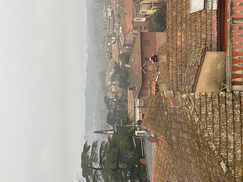 An elevated, wide-angle view captures a residential area of Sinalunga, Italy, under an overcast sky. The foreground is dominated by multiple red-tiled rooftops, many exhibiting heavy moss and grime, suggesting age and damp conditions. Visible rooftop elements include several brick chimneys with terracotta caps, two red satellite dishes, a white outdoor air conditioning unit, and multiple television antennas. A red-orange balustrade with white balusters is partially visible in the lower right, indicating the vantage point. The midground features a dense cluster of red-roofed buildings, primarily residential, interspersed with numerous trees, including large evergreens and some bare deciduous trees. A distinctive, tall, dark spire or bell tower rises prominently on the left, behind a large evergreen tree and above the surrounding rooftops. The background consists of rolling hills or distant terrain, heavily vegetated and appearing hazy or misty, fading into the uniformly light-gray, overcast sky. No people, discernible actions, or interactions are visible within the scene. The overall lighting is diffuse and flat.