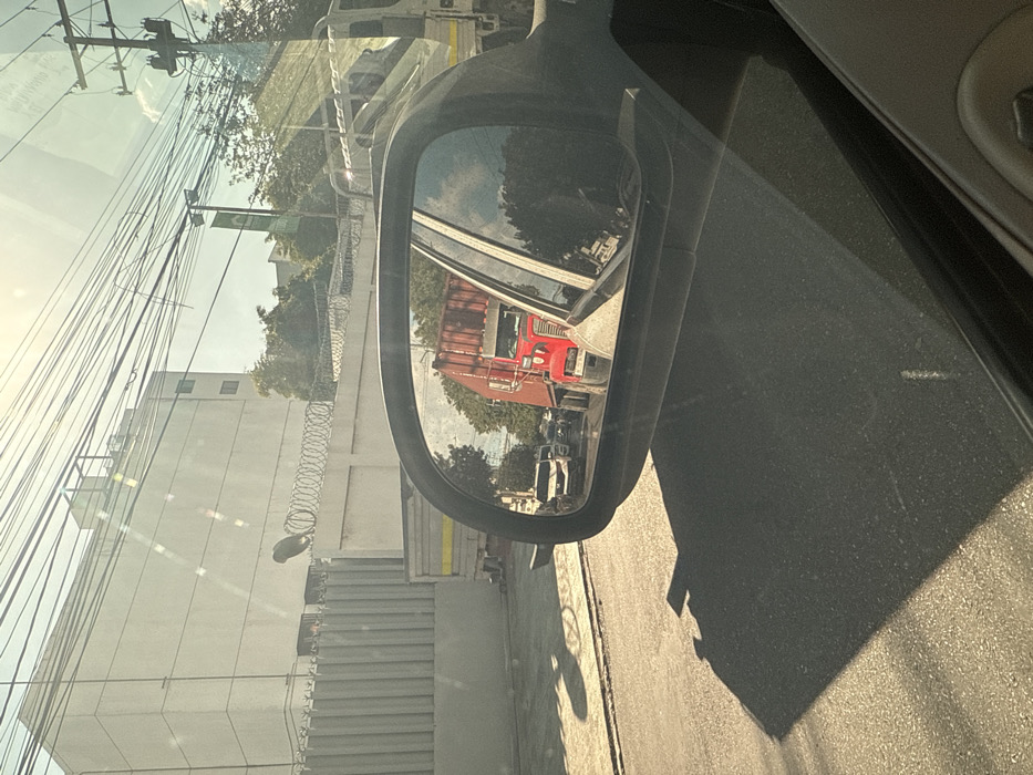 A car's side mirror reflects a red truck followed by a white pickup truck. Outside the car, a modern building with many windows is visible. There's a fence topped with barbed wire and telephone poles with wires are in view. The road is asphalt with a shadow cast on it. The image is taken from inside a car, capturing the interior door and window.