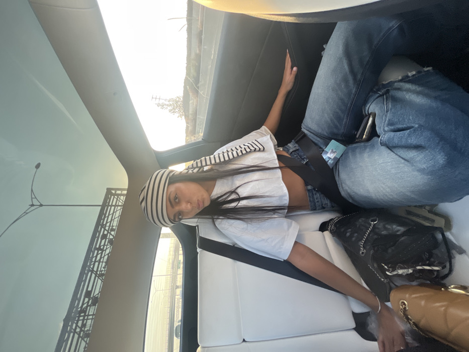 young woman seated in the rear passenger side of a vehicle in Kafr Kasim, Israel, during daylight hours, likely late afternoon. The woman, who has long dark hair, is wearing a white and black striped headscarf, a white short-sleeved crop top, and loose blue denim jeans. A black seatbelt is fastened across her chest and lap. She is looking directly at the camera with her lips pursed. Her left arm rests near a black quilted shoulder bag with a silver chain strap positioned on the white seat beside her. Her right hand is placed on the interior door panel. A light-colored card or tag is visible tucked into her jeans under the seatbelt on her right side. The vehicle's interior features white seating and a panoramic glass roof. Outside the vehicle, visible through the windows, is a multi-lane roadway. On the left, a large bridge structure with metal railings is visible, while on the right, sparse vegetation, including trees and utility poles, is present under a bright sky with a low sun.