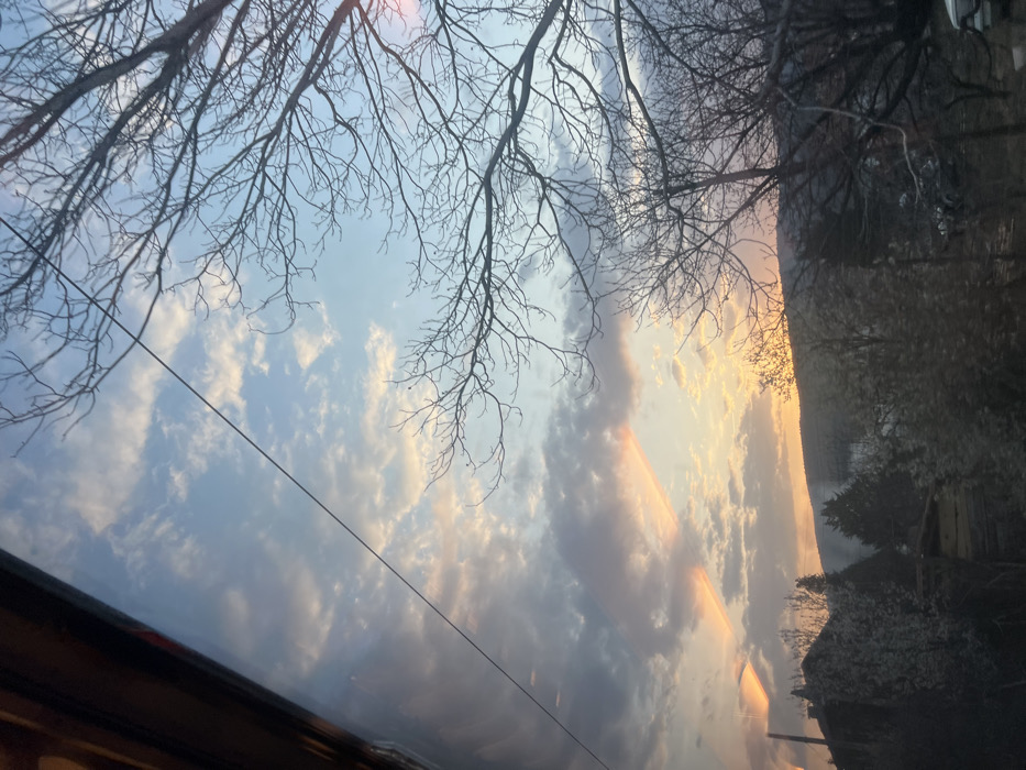 The image depicts a sunset over the city of Usoika, Bulgaria. The sky displays a gradient from light blue overhead to warm pink, orange, and golden yellow hues near the horizon. Scattered clouds are present, and distinct crepuscular rays are visible in the mid-left, emanating from the setting sun. A dark, reflective surface, consistent with an interior window frame, occupies the upper-left quadrant. A thin black line, appearing to be a wire or utility line, traverses the upper-middle of the frame. In the midground, numerous deciduous trees, primarily bare, are silhouetted against the sky, with their intricate branch structures prominent, especially on the right. Some trees in the lower-left and central midground exhibit white blossoms, indicative of spring. Residential structures with dark roofs are partially visible among the foliage in the lower-left. A range of vegetated hills or mountains forms the distant background. No individuals, specific actions, or interactions are observable.