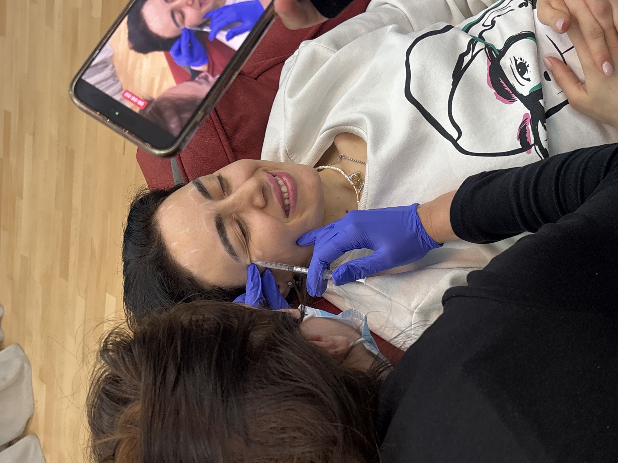 woman lying on a red couch receiving a cosmetic injection in her face. She is wearing a white sweatshirt with a cartoon graphic on the front and a pearl necklace. A person wearing blue gloves is administering the injection. Another person is filming the procedure on a smartphone. The smartphone display shows a recording of the same procedure. A person with dark, wavy hair is standing beside the woman receiving the injection, partially visible. The background includes a wooden floor and a white object, possibly furniture. While a precise location cannot be identified, the setting may be a clinic or cosmetic practice. The city of Tbilisi, Georgia, is a requested detail but is not explicitly evident in the image.