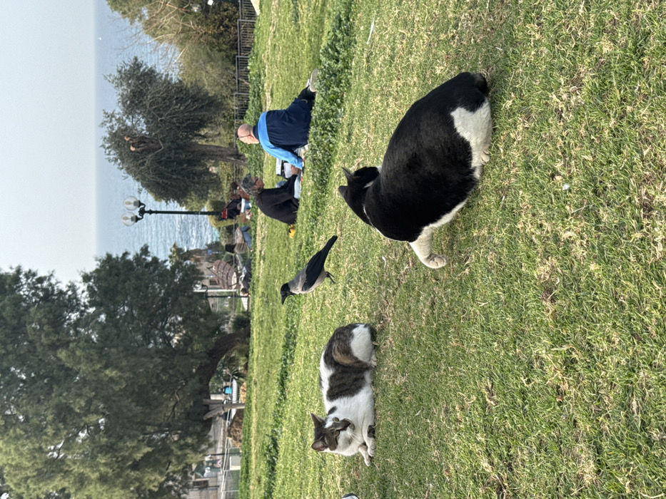 The image captures a daytime scene in a coastal park in Tel-Aviv, Israel, overlooking the Mediterranean Sea, likely in the vicinity of Jaffa. In the foreground, two domestic cats are resting on short green grass. The cat on the left is white with distinct brown and grey tabby markings, lying prone and facing left. The cat on the right is predominantly black with white fur on its underside and paws, positioned on its side facing away from the viewer and slightly to the left. Between the cats and a group of people further back, a hooded crow stands on the grass, facing right. In the midground, two individuals are seated on the grass, facing each other. The person on the left has dark hair and wears a dark long-sleeved top. The person on the right is bald and wears a blue and white tracksuit jacket. White objects are visible on the grass between them, suggesting a shared activity. Further down the grassy slope, additional figures are present, some seated on the ground. A black street lamp with two lights stands upright, separating the midground from the distant sea. The background features the blue Mediterranean Sea under a pale, slightly hazy sky, with a small white object visible on the horizon. Several mature trees with dense foliage are present, including a large, dark green conifer on the left and a smaller, gnarled tree on the right. Below the park level, light-colored buildings with distinct architectural features are visible. A dark metal fence runs horizontally across the mid-background, marking a boundary within the landscape. The scene is illuminated by natural daylight.