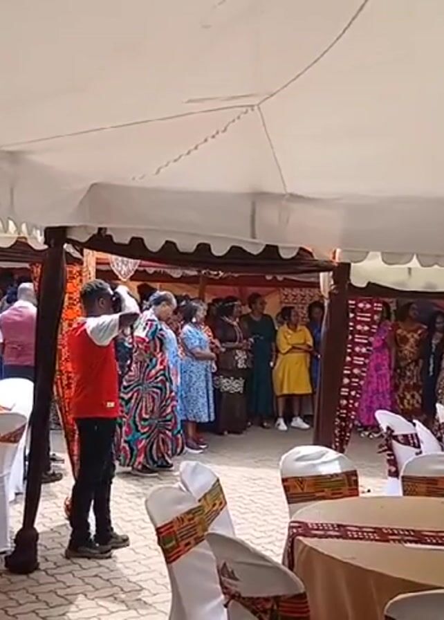 A group of people are gathered in a courtyard for an event. The event is taking place under several white tents. Round tables with tan tablecloths and white chairs are arranged under the tents. The chairs are decorated with a band of fabric with colorful geometric patterns. A man in a red shirt is taking pictures of the group with his phone. The group of people are dressed in a variety of colors and patterns. A security guard is standing near a table with a laptop. A sign is visible behind the group that says "R.I.P. RADIO" and features a picture of a man.