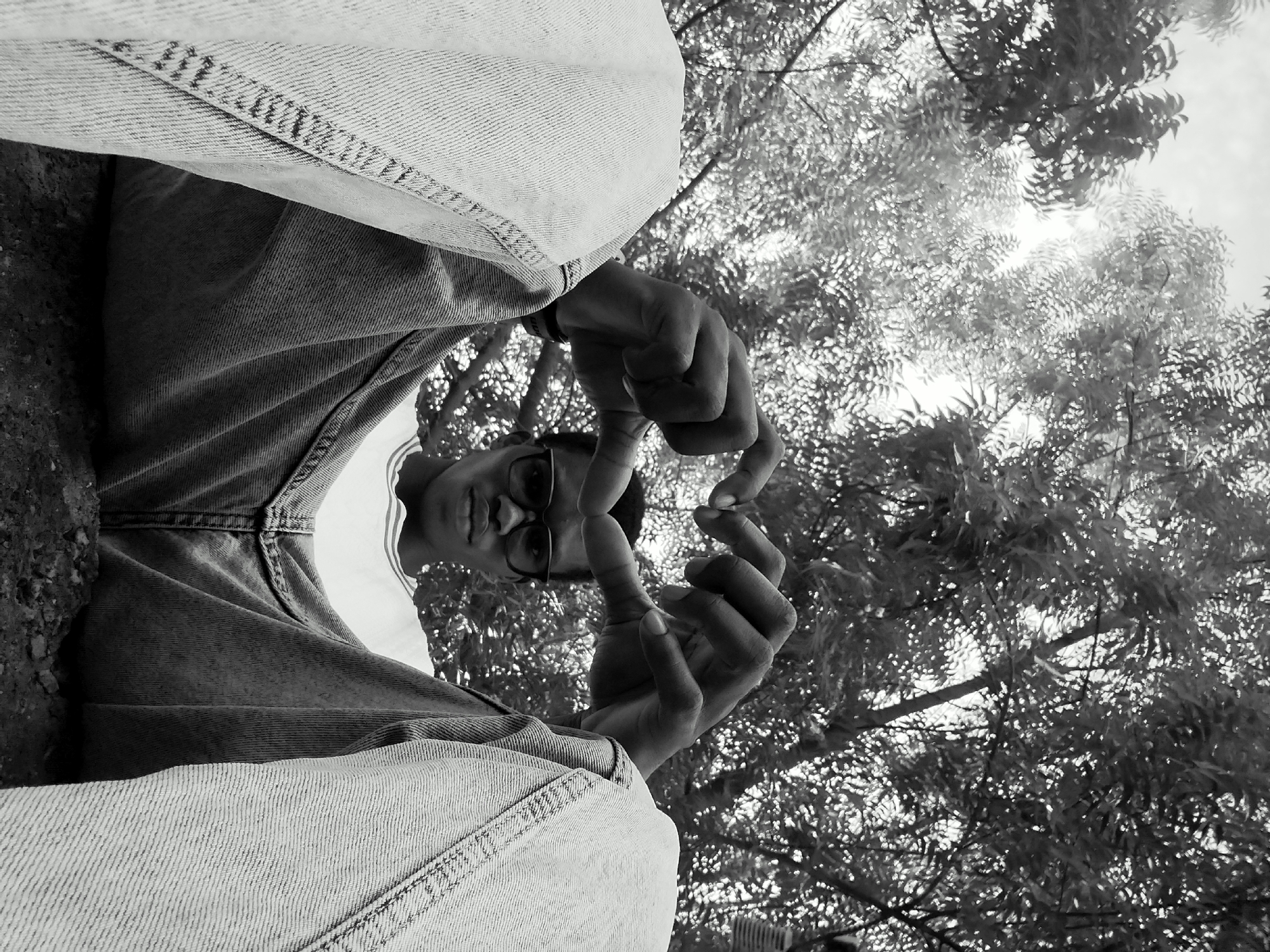 This black and white image depicts a low-angle perspective looking up at a single individual positioned outdoors in Keffi, Nigeria. The subject, appearing male and wearing dark-rimmed glasses, is seen from the torso upwards, framed by their own light-colored denim trousers. The individual is wearing a white garment, possibly a t-shirt, visible at the collar. Both hands are raised in front of the subject's face, with fingers interlocked or touching to form a symbolic shape, possibly a heart. The subject's gaze is directed downward, engaging directly with the camera. The background consists of a dense canopy of leafy trees, with several bright patches of sky visible through the foliage, indicating an outdoor, sunny environment. The immediate ground surface around the subject's position is obscured, but dark, textured ground is visible beneath the legs. The specific location within the city of Keffi cannot be further determined from the visual evidence.