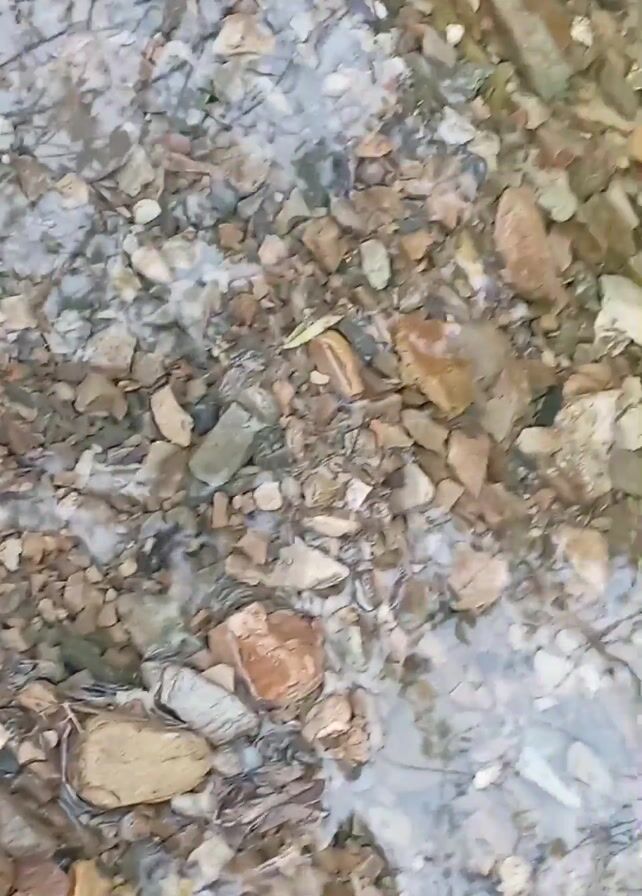 shallow stream flowing over a bed of rocks. The rocks are various sizes, mostly small to medium, and are various shades of gray, brown, and tan. The water is clear, with slight ripples on the surface, reflecting light and creating a shimmering effect. The camera appears to be positioned directly above the stream bed, providing a top-down view.