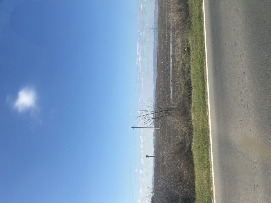 The image depicts a rural, agricultural landscape near Badeshte, Bulgaria, under a clear blue sky with a single distinct white cloud in the upper left quadrant. The perspective is from a vehicle on an asphalt road in the immediate foreground, showing a white solid line on the road's right edge. Adjacent to the road is a narrow strip of green grass, followed by an expanse of dry, sparse, brown vegetation and leafless bushes that border a large, dark brown, seemingly tilled or fallow agricultural field. Within the field, several irregular patches of standing water reflect the sky. In the midground, a wooden utility pole with multiple overhead wires stands upright. Further left in the midground, a tall, dark, cylindrical structure, possibly a water tower or silo, rises from the field. The horizon features distant, hazy hills or mountains beneath a band of light cloud cover. No individuals, animals, or active interactions are present in the scene.