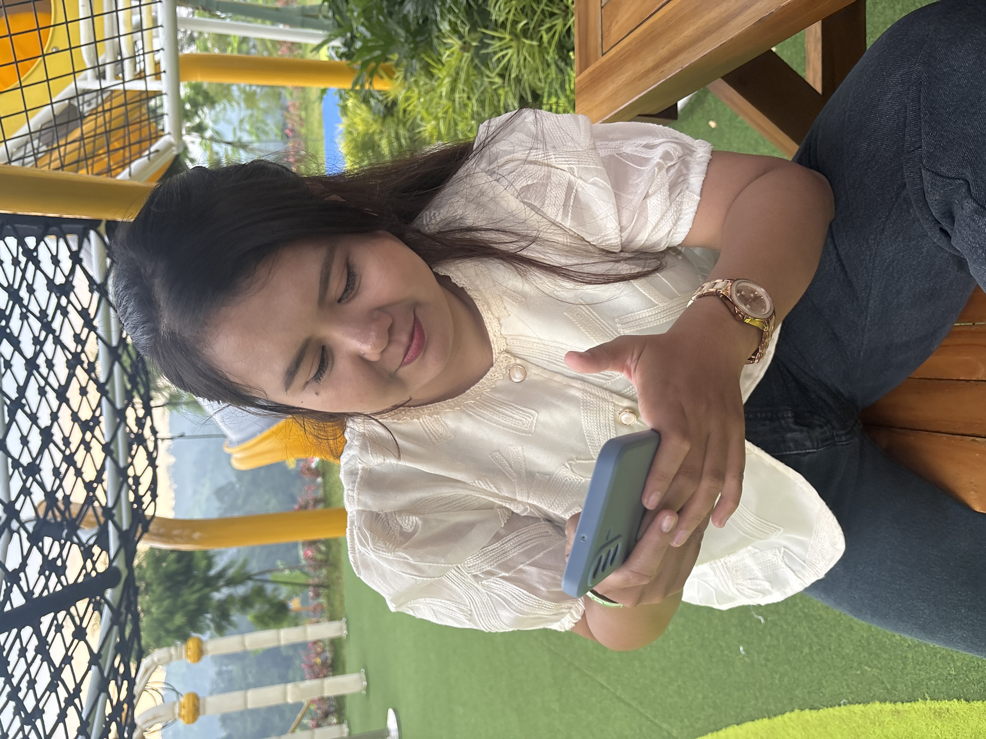 A woman is sitting on a wooden bench and looking at a blue smartphone she holds in her hands. She is wearing a white shirt and dark jeans. A gold-colored wristwatch is visible on her left wrist. The background shows a playground structure with yellow and black elements, greenery, and trees. The location is Prigen, Indonesia.
