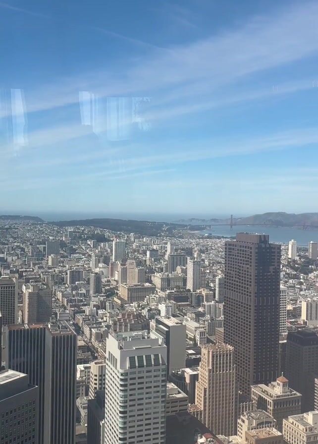 panoramic view of San Francisco's skyline on a clear, sunny day. The cityscape is filled with numerous buildings of varying heights and architectural styles. The Golden Gate Bridge is visible in the distance, spanning the water. The sky is blue with wispy clouds. The viewpoint is from a high vantage point, likely an upper floor of a building. There are window reflections visible in the shot.