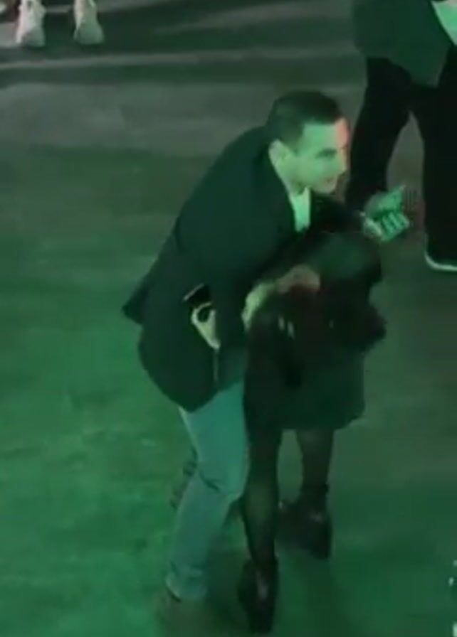 A man and a woman are dancing together in a dimly lit space. The floor is green. The man is wearing a black blazer, light blue jeans, and brown shoes. The woman is wearing a black dress, black stockings, and black shoes. They are closely embracing as they dance. Other people are standing around, observing. Some are wearing costumes.