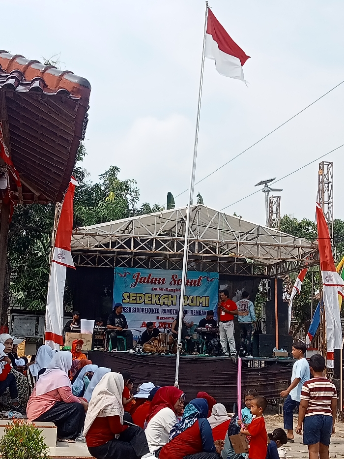 The image depicts an outdoor communal gathering in Desa Sidorejo, Kecamatan Pamotan, Kabupaten Rembang, Indonesia. The central focus is a temporary outdoor stage with a metal truss structure and a white tarp roof. A prominent blue banner on the stage advertises "Jalan Sehat" (Healthy Walk) and "SEDEKAH BUMI" (Earth Thanksgiving/Ritual), specifying the location "DESA SIDOREJO KEC. PAMOTAN KAB. REMBANG." On the stage, several men are present. To the left, musicians are seated with instruments, including a keyboard and percussion. To the right, a man in a red polo shirt, white pants, and sunglasses addresses the crowd via a microphone, standing beside another man in a light blue jacket. In front of the stage, a crowd, primarily composed of adult women wearing various colored hijabs, is seated on the ground and steps, facing the stage. Children are interspersed among the adults; a young boy in a red shirt holds a pink inflatable object, and another boy in a striped shirt stands nearby. A tall flagpole stands centrally, flying a red and white Indonesian flag. Additional vertical red and white banners adorn structures to the left and right of the stage. The upper left foreground shows a portion of a building with traditional red-tiled roofing and dark wooden eaves. The background features green trees and utility poles with solar panels, under a partially cloudy daytime sky.