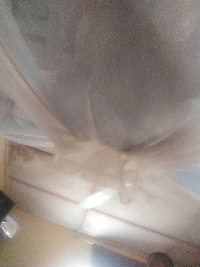 The scene depicts an interior view in Sabon Tasha, Nigeria, primarily looking upwards. A voluminous, light-colored, sheer fabric, likely a mosquito net, occupies the upper two-thirds of the frame, draped downwards and obscuring the ceiling in parts. Below this fabric, a white three-bladed ceiling fan is visible, with its blades blurred, indicating it is in operation. The ceiling is light-colored, possibly white or cream, constructed from panels with visible seams. In the upper left quadrant, an area of dark discoloration or staining is present on the ceiling or wall intersection. The lower left corner shows a portion of a wall, light in color. In the lower right quadrant, the upper portion of a human head is partially visible, showing dark skin and hair, with the individual looking upwards towards the fan and fabric.