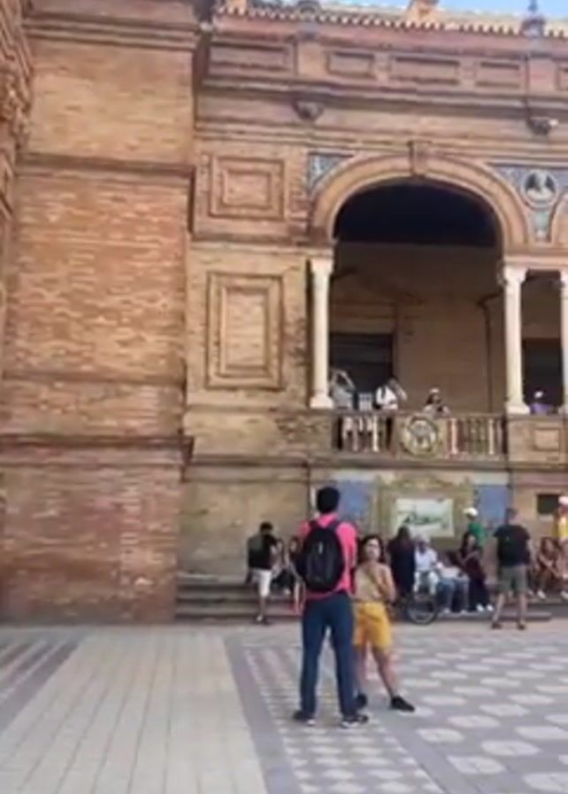 public square in Seville, Spain, filled with people. The camera pans across the scene, revealing the architectural features of the Plaza de España, including brick buildings adorned with arches and tiled details. People are standing around, taking pictures, and interacting with each other. Some are sitting on steps, while others are walking through the square. The sky is clear and blue, suggesting a sunny day.