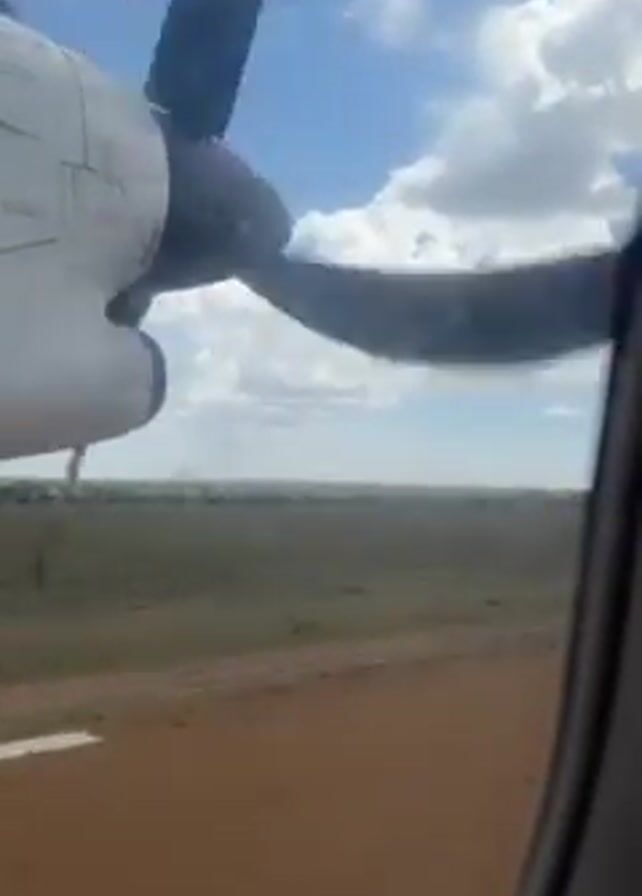 view from an airplane window. In the foreground is part of the airplane, including the propeller spinning rapidly. Beyond the propeller, the ground is visible, appearing to be a dry, grassy plain with some trees. The sky is blue with scattered white clouds.