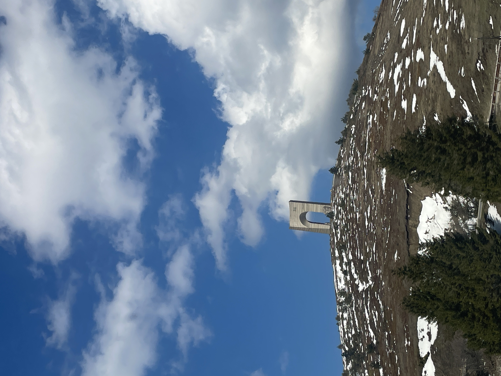 monument, likely in a mountainous area near Hristo Danovo, Bulgaria. The monument is a concrete arch on the side of a hill or small mountain covered in dry vegetation and scattered patches of snow. The sky is blue with scattered white clouds. The image appears to be taken from a low angle, looking upwards at the monument and sky.