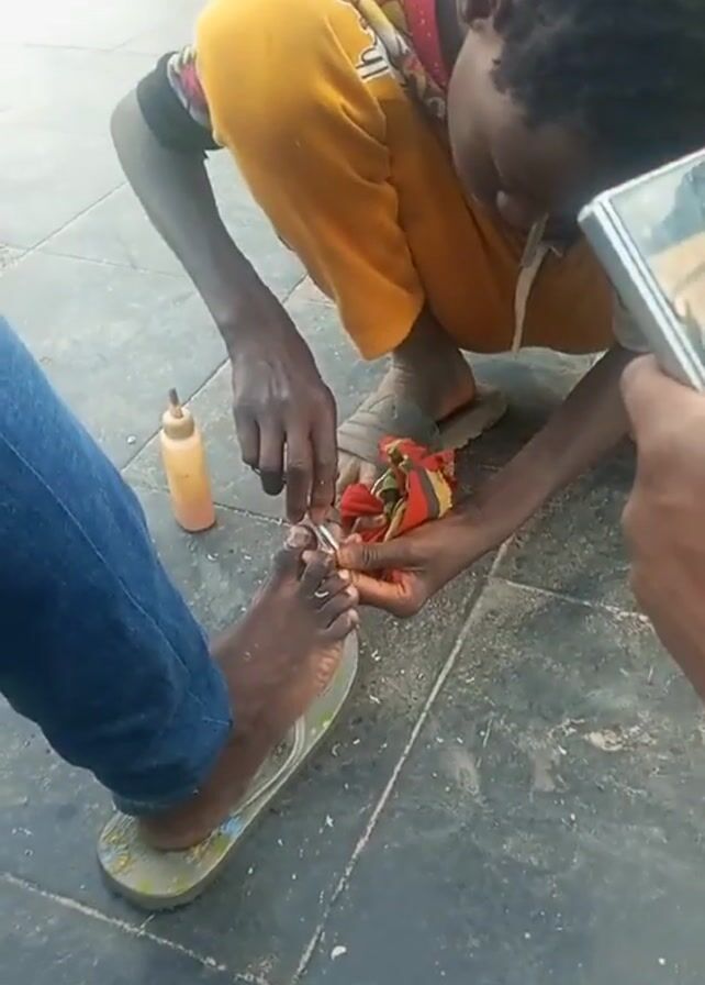 person sitting on their haunches and giving a pedicure to another person seated in a chair. The person giving the pedicure is wearing a long-sleeved shirt, yellow pants, and sandals. They are using a pair of tweezers to work on the toenails of the person receiving the pedicure. The person receiving the pedicure is wearing jeans and sandals. There is a small bottle of liquid next to their foot. The setting appears to be an outdoor patio or walkway. There are other people walking in the background. A third person is recording the interaction with a smartphone.