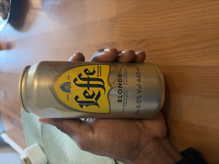 A close-up image displays a dark-skinned human hand holding a silver 440ml Leffe Blonde beer can
