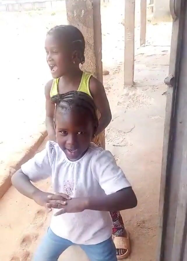 Two young girls are standing outside, on a dirt-covered area. The girl in front is wearing a white t-shirt, blue jeans, and tan sandals. She has braids. She is facing the camera and smiling. The girl behind her is wearing a yellow tank top, patterned pants, and tan sandals. She also has braids. She is turned slightly to the side and looks like she is talking. Behind the girls is a partially visible building with support columns. There is a partially open door on the right side of the frame.