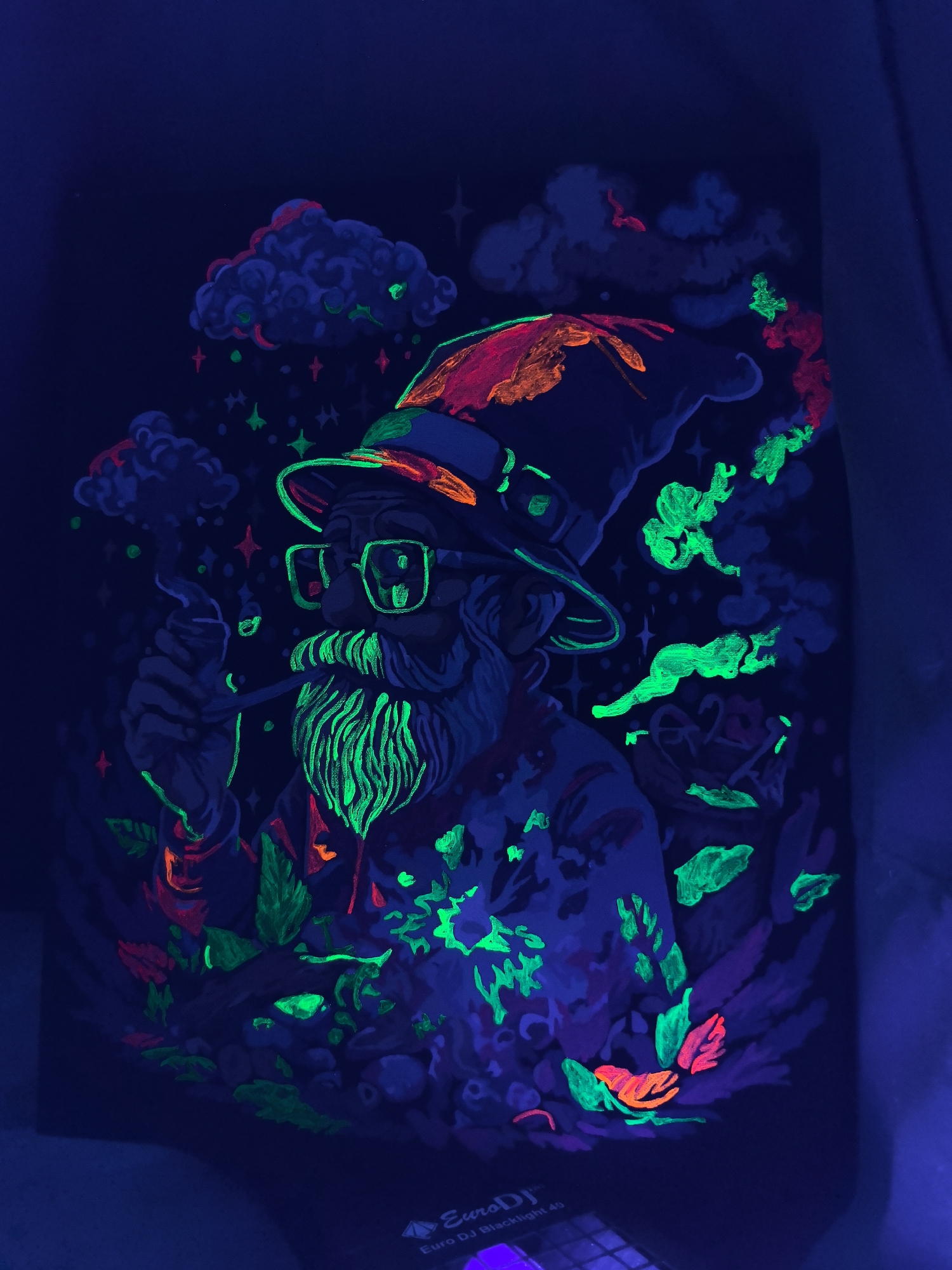 An ultraviolet-illuminated artwork, likely a painting or print on a dark surface, depicts a stylized, glowing figure against a dark blue background with scattered stars and clouds