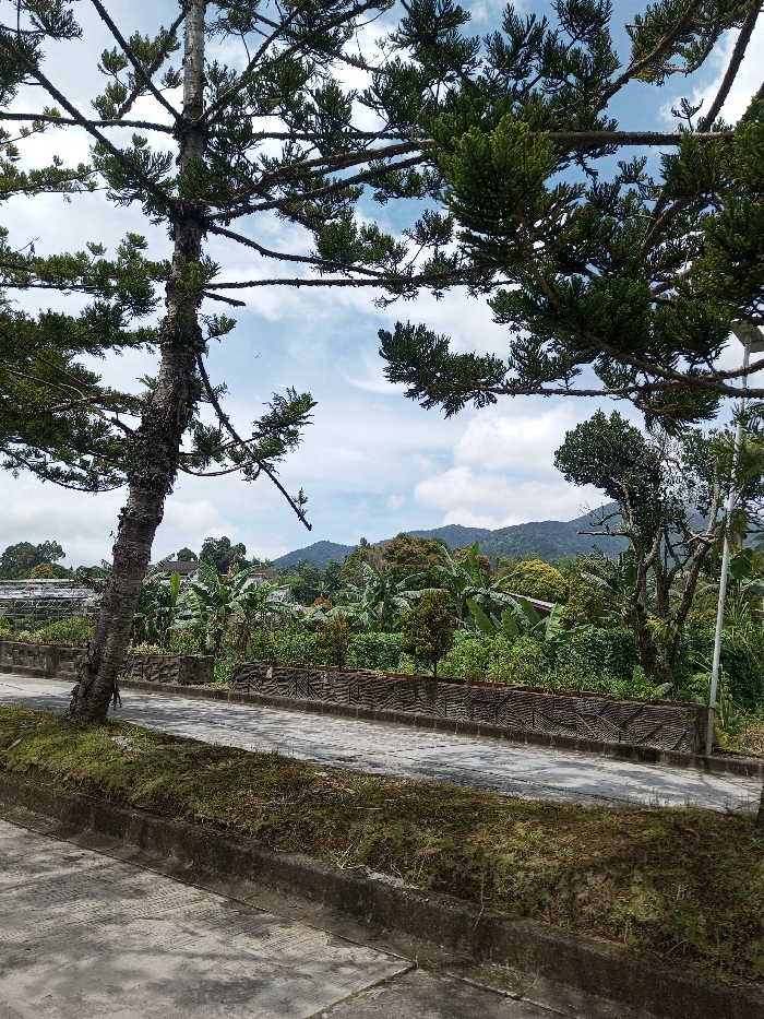 An outdoor, daytime scene in Vieng Phouka, Laos, captures a static view of a paved area bordered by lush vegetation and distant mountains. In the foreground, a light-grey paved surface occupies the lower left, adjacent to a dark concrete curb separating it from a narrow strip of dark green, low-lying ground cover. Beyond this strip, a textured, darker grey paved path runs horizontally across the mid-ground, backed by a low concrete wall featuring a repeating, geometric relief pattern. A tall, coniferous-type tree with a thick, textured trunk and dense, dark green foliage stands prominently on the left, its numerous branches extending across the upper portion of the frame, partially obscuring a partly cloudy blue sky. To the far right, a white pole, consistent with a streetlight, is partially visible. Beyond the patterned wall and path, a dense expanse of tropical vegetation is evident, featuring large-leafed banana plants and various other green trees and shrubs. To the far left, a light-colored framework, possibly a greenhouse or agricultural trellis system, is partially visible within the foliage. In the mid-distance, obscured by the dense greenery, residential structures with dark roofs can be discerned. The background is defined by a range of dark green, forested mountains extending to the horizon beneath the scattered white clouds. No individuals or discernible activities are present in the frame.