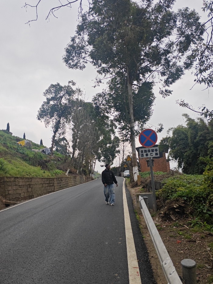 The image depicts a rural or semi-rural road scene in Bishan, China, under an overcast sky. An adult male, dark-skinned, wearing a dark hooded jacket, light blue jeans, and white sneakers, walks along the left side of a dark asphalt road, moving away from the viewer. His gaze is directed towards the right side of the road. The asphalt road, dark grey, features a solid white line marking its right edge. To the left of the road, an earthen embankment rises, partially supported by a retaining wall of stacked rectangular blocks. The embankment is covered in green vegetation, and further up, several small, conical or pagoda-like structures are visible, along with some light-colored tarps or sheets. On the right side of the road, a metal guardrail runs parallel to the asphalt. Beyond the guardrail, dense green foliage and exposed soil are present. A prominent circular "no stopping" sign (red circle, blue background, red diagonal cross) is mounted on a grey pole, accompanied by a white rectangular sign with black Chinese characters: "全路段禁停 违者必罚" (No stopping on the entire road section. Violators will be punished). Further down this side, a tall tree with dark green leaves stands prominently, and a red brick structure is partially visible behind the foliage. Two yellow triangular warning signs are also visible further along the right side. In the distance on the right, a white car is partially visible. Tall trees with varying densities of foliage line both sides of the road.