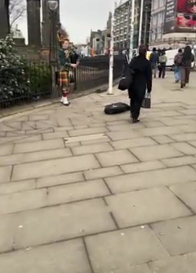 man playing the bagpipes on a city sidewalk in front of a wrought iron fence. He is wearing a traditional Scottish kilt with a green vest and white hose. A black bag is open on the sidewalk nearby, presumably to collect money. People walk past the bagpiper. The background includes a large building, what appears to be a historical church ruin, and a street with cars and pedestrian traffic. The weather appears overcast.